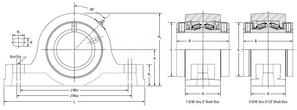 | Note | Note: All units have a 1/Series 8" pipe thread grease fitting The Maximum Permissible Thrust Load applies to conditions of slip fit with set screw mounting or in applications where a large moment loading occurs. The values shownare valid only when two collars and set screws are used. When heavy thrust forces are applied, the friction between the pillow block base may not be sufficient to prevent movement. Mechanical stops or shear bars withstrength sufficient to support the load should be added. Never weld the pillow block or bearing to secure it to the shaft or base. | ||