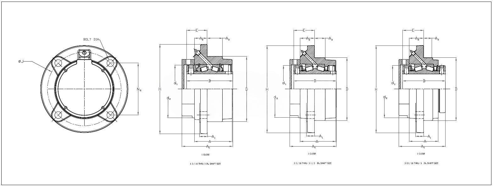 | Note | Note: All units have a 1/8" pipe thread grease fitting The Maximum Permissible Thrust Load applies to conditions of slip fit with set screw mounting or in applications where a large moment loading occurs. The values shownare valid only when two collars and set screws are used. When heavy thrust forces are applied, the friction between the pillow block base may not be sufficient to prevent movement. Mechanical stops or shear bars withstrength sufficient to support the load should be added. Never weld the pillow block or bearing to secure it to the shaft or base. | ||